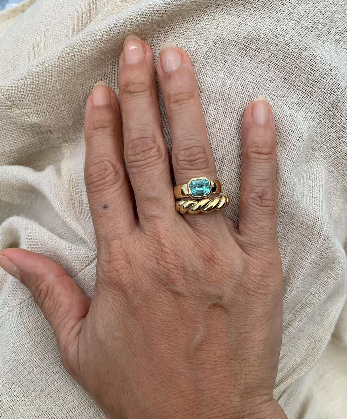 Beautiful worn on its own or stacked with your favorite pieces, the Large Alora is shown paired with our Primo Ring, while the Small Alora stacks seamlessly with our Rise Ring and River Aquamarine Ring. Its elegant twist catches the light with every movement, offering a classic design with an organic, modern feel.