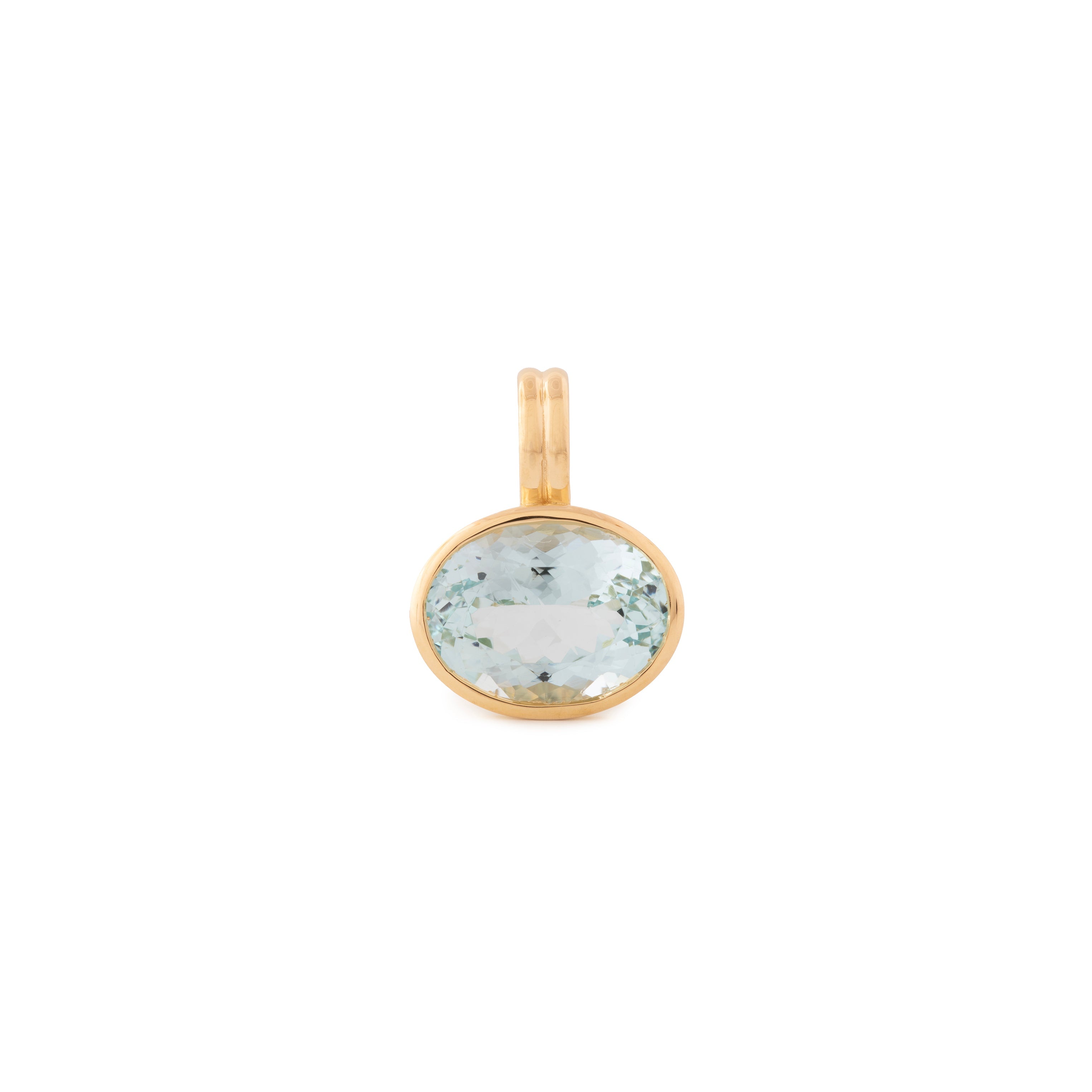 Aquamarine is a stone associated with the element of water. It is believed to bring its wearer its wearer in touch with the subconscious and with one’s deepest emotions. This stone is said to protect sailors at sea, counteract the forces of darkness, and aid in understanding ones emotional states. This 5 carat gem is beautifully set in a light-filled bezel, crafted from solid 18k gold. Size and color of stones may vary slightly.