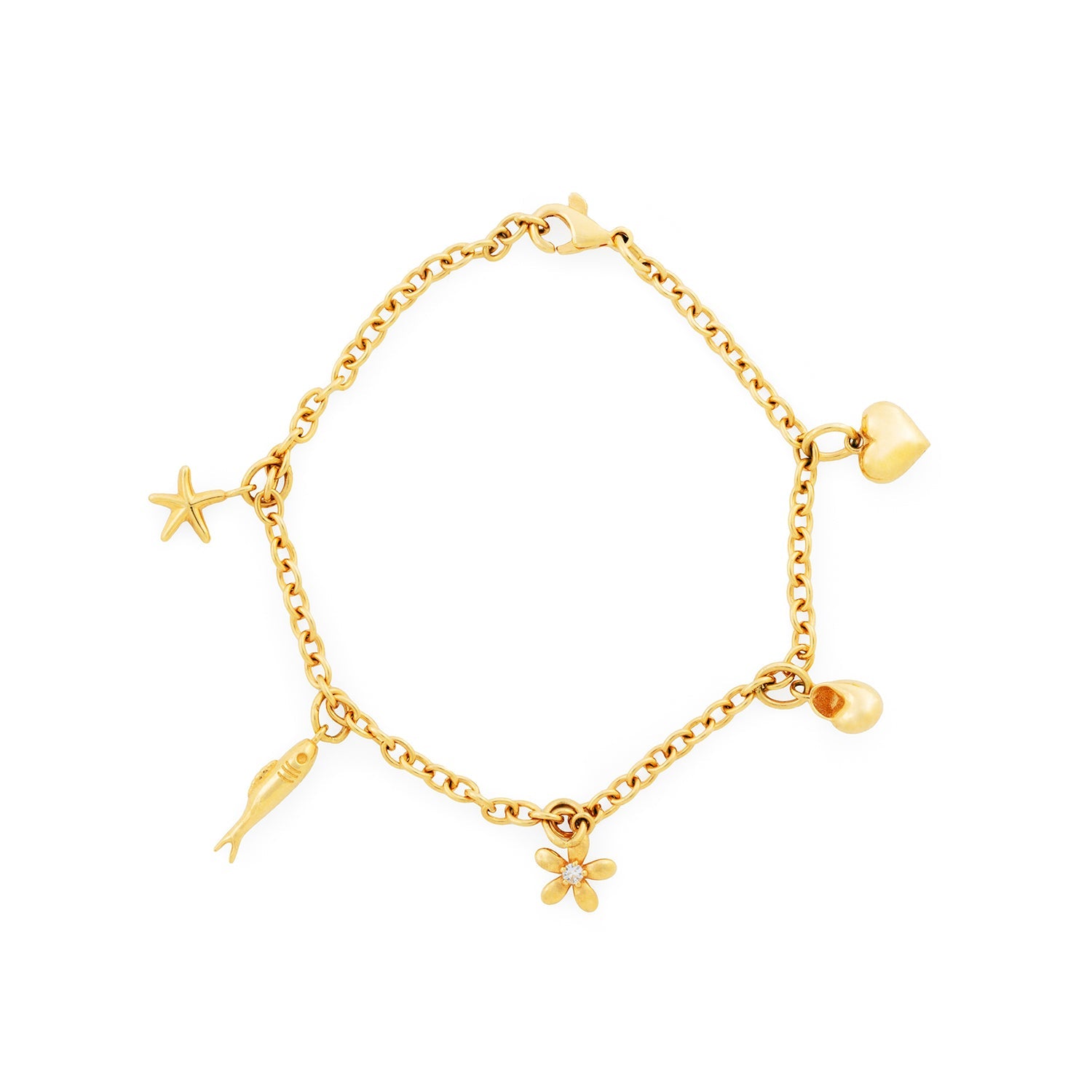 The Elements Charm Bracelet celebrates the beauty of nature with five intricately designed charms: a sapphire flower, fish, nautilus shell, puffed heart, and starfish, each averaging 7.55mm in length. This bracelet, measuring 7 inches, is inspired by the gifts of land and sea. Available in either 14k or 18k solid gold. Extended sizes are available upon request for a personalized fit.
