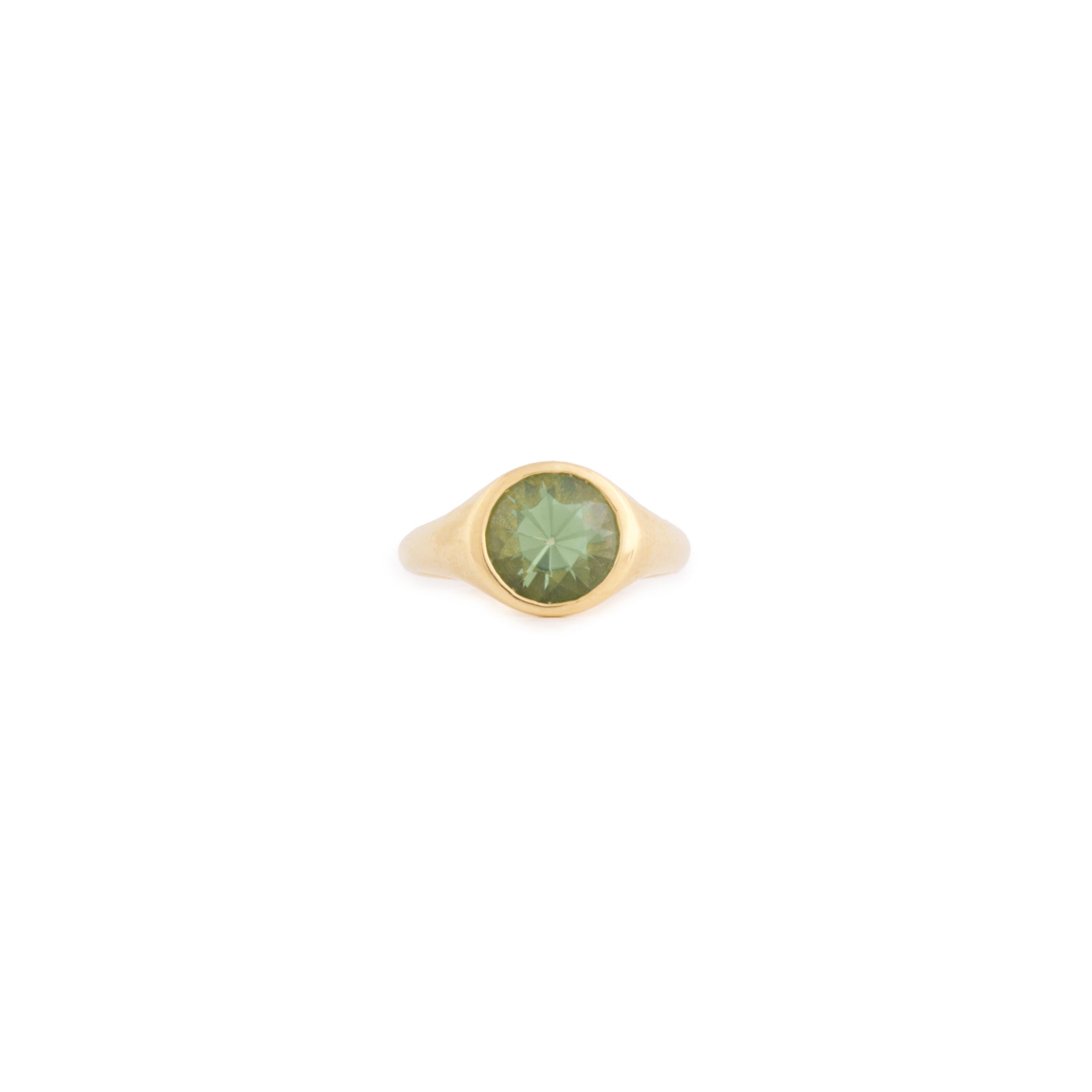 Green tourmaline is known as a nurturing stone that is beneficial for self healing and issues of the heart. It is said to invoke feelings of stability and wholeness and known to be associated with the signs Virgo and Capricorn. The Osha ring features a vibrant green, round cut tourmaline at its center, radiating energy and brilliance. The gemstone is securly set in a defined bezel offering a modern yet elegant look. This 3.4 carat stone is hand set in 18k solid gold. Ready to ship in size 6. Resizing options available upon request. If resized all sales final and please allow an extra 4 weeks.