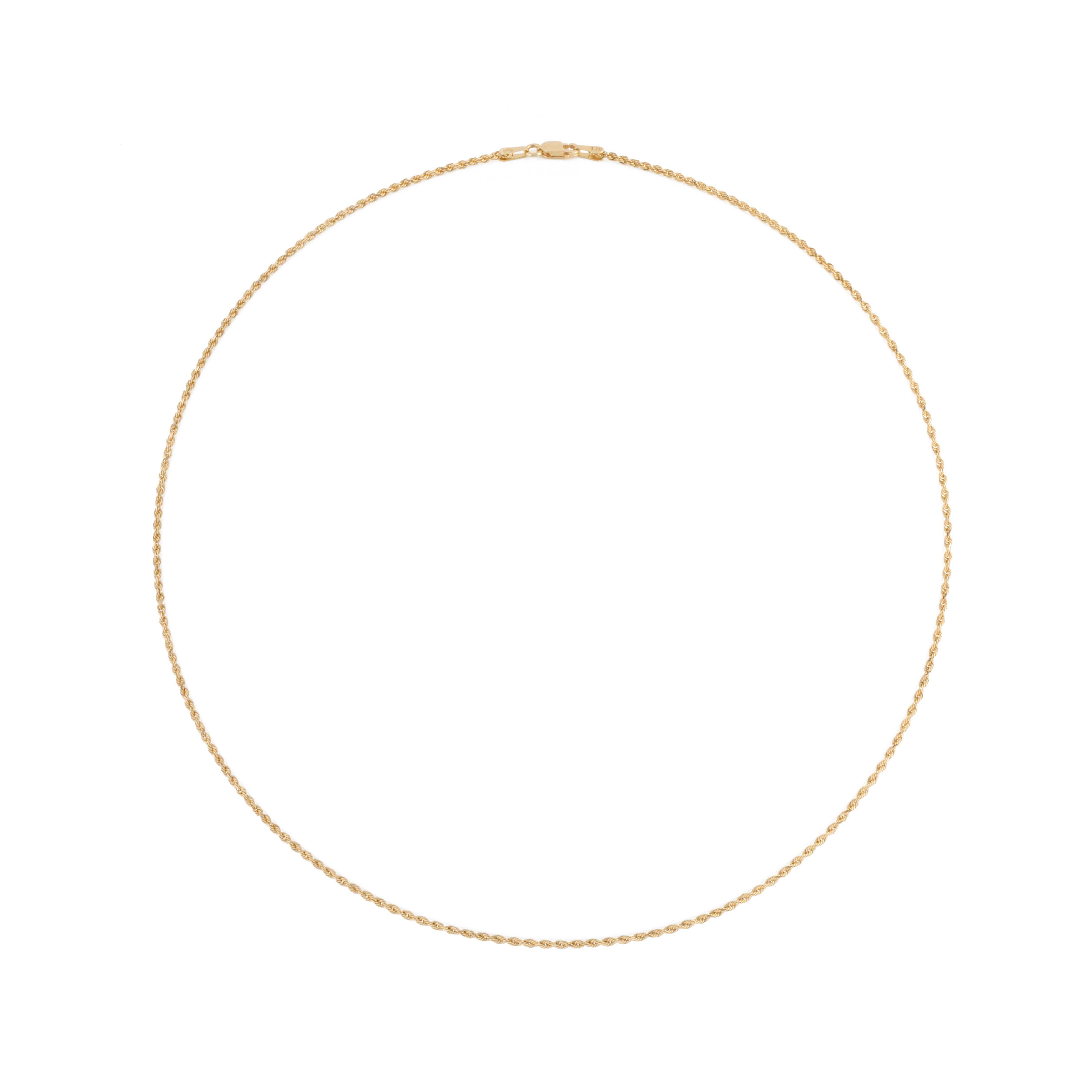 A delicate twisted rope chain crafted from solid 14k gold, featuring a secure lobster clasp closure. The chain measures 1.5mm in width, offering a timeless and versatile design. Available in 18, 20 and 22 inches. Kindly allow 4-12 weeks for your item to be made and delivered.